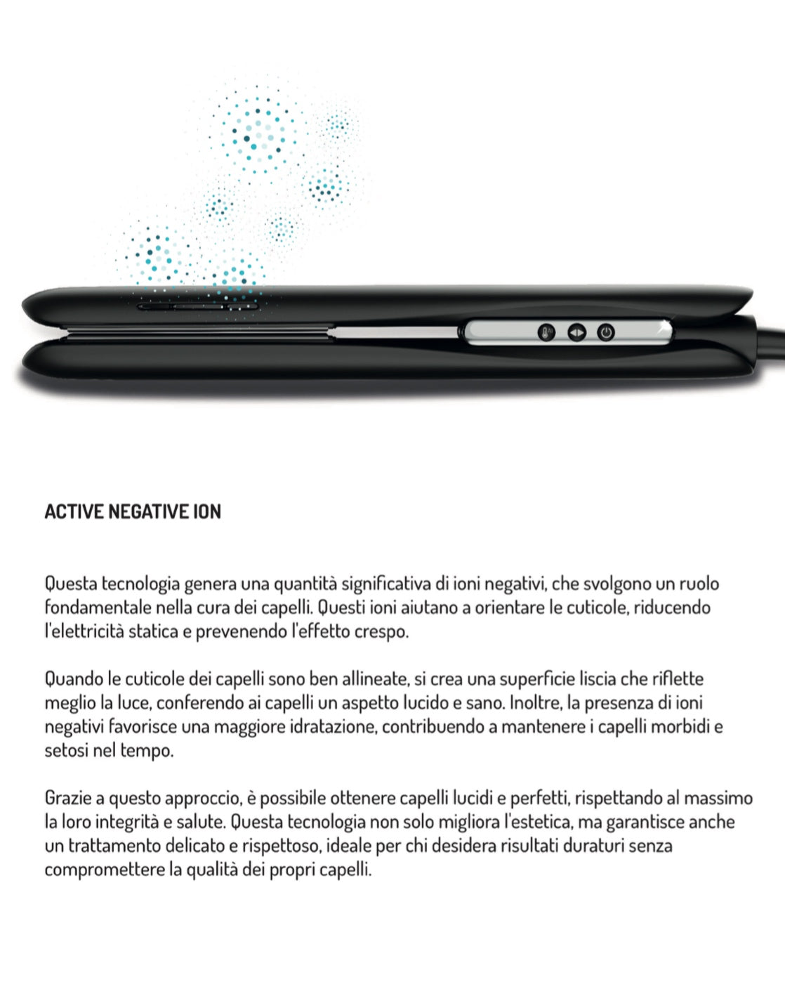 Infine, la tecnologia Active Negative Ion combatte l’effetto crespo, lasciando i capelli morbidi, disciplinati e luminosi dopo ogni passata.
